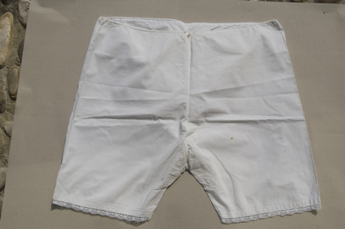 corte di colore bianco in tessuto di cotone . In vita una coulisse. Basso pizzo applicato sul bordo inferiore della gamba.