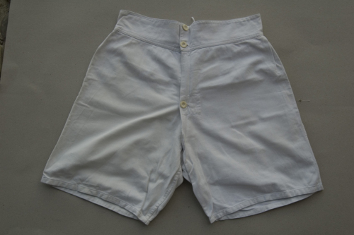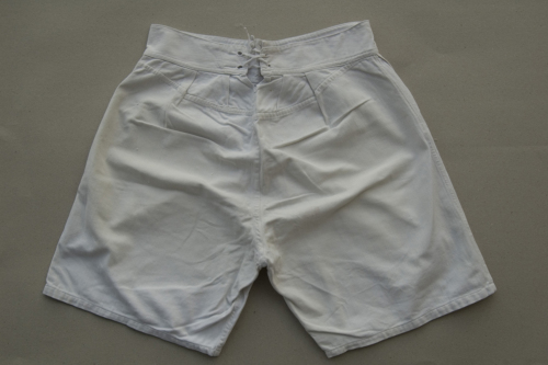 corte in tela bianca di cotone; la patta sul davanti è chiusa da tre bottoni in plastica; sul dietro all'altezza del cinturone l'apertura è chiusa con una fettuccia allacciata a "x"; sotto il cinturone ci sono delle pinces.
