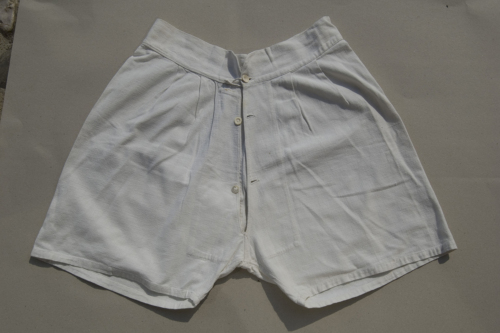 corte di colore bianco in tessuto di cotone. In vita un alto cinturone sotto il quale ci sono delle pinces. La patta è chiusa con tre bottoni in plastica.