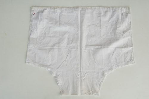 sgambate in tela bianca di cotone; elastico in vita; lettera A ricamata con filo rosso sul davanti sulla sinistra; sul bordo della sgambatura è cucito un merletto.