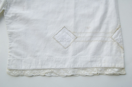 corte di colore bianco in tessuto di lino. In vita hanno l'elastico. Sono aperte sui lati dove si allacciano con due bottoncini in madreperla e si legano con due fettucce. Sulla gamba hanno un ricamo decorativo floreale a punto pieno inserito in un motivo geometrico a punto a giorno. Sul bordo è applicato un pizzo.