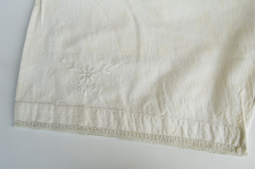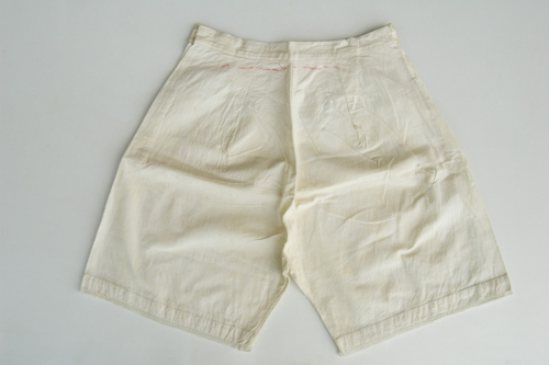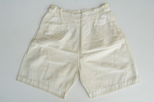 corte di colore bianco in tessuto di cotone. In vita hanno un cinturone a "v". Sono aperte sui lati dove si allacciano con due bottoni in plastica per lato. Sulla gamba hanno un ricamo decorativo floreale a punto pieno. Sul bordo è applicato un pizzo.