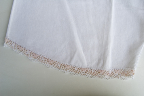 corte di colore bianco in tessuto di cotone. In vita hanno un cinturino a "v". Sono aperte sui lati dove si allacciano con due bottoni in plastica uno diverso dall'altro e fettucce. Sul bordo è applicato un pizzo di colore bianco e rosa.