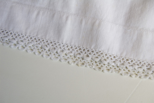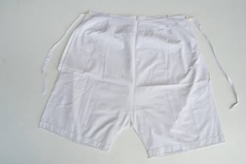 corte di colore bianco in tessuto di lino. In vita hanno un cinturino a "v". Sono aperte sui lati dove si allacciano con due bottoni in plastica e fettucce. Sul bordo è applicato un merletto lavorato all'uncinetto.