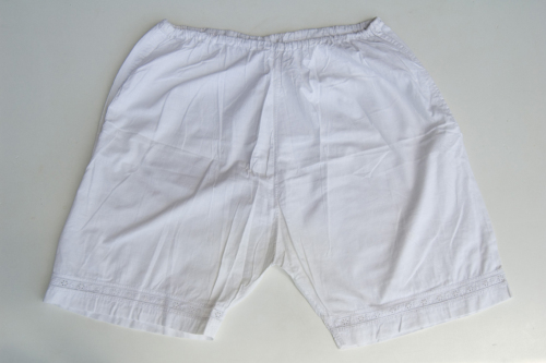 corte di colore bianco in tessuto di cotone. In vita hanno l'elastico. Erano aperte sui lati e sono state cucite. Sul fondo della gamba hanno un ricamo decorativo floreale a punto pieno e a punto a giorno.