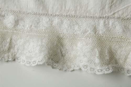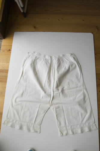 lunghe di colore bianco in tessuto di lino. Sono aperte sui lati dove si allacciano con due bottoni in madreperla. Sul fondo della gamba sono applicate due bordure in pizzo.