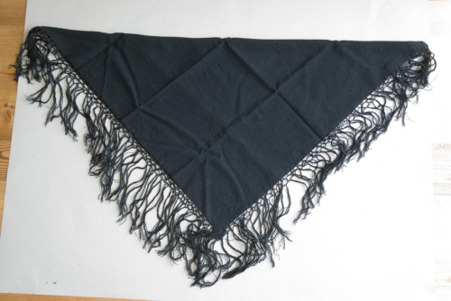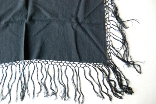 Fazzoletto da testa nero in lana con frange applicate con due legature.
