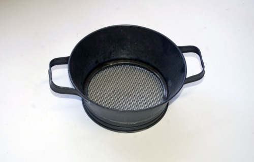 oggetto in alluminio a sezione circolare con base di diametro inferiore rispetto alla bocca superiore e sponda svasata verso l'alto. Dotato di due manici contrapposti sotto il bordo superiore arrotondato e di rete metallica sollevata dal fondo.