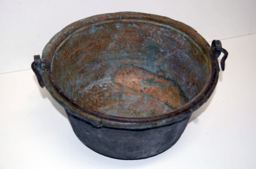 recipiente in rame di forma svasata con fondo tondeggiante e bordo superiore formato da una lamina ripiegata sopra una sporgenza arrotondata. Fessurazioni presenti lungo tutto il bordo. Completo di manico in ferro ad arco, le cui estremità sono inserite in due anelli laterali, formati da bande in rame incrociate e fissate con 4 borchie in rame al contenitore. Sul fondo, internamente, sono state fissate, con borchie in rame, una larga lamina in rame per rinforzare una parte fessurata e una più piccola di forma circolare. Parte esterna dell'oggetto completamente ricoperta da caliggine.