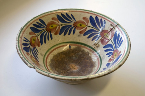 recipiente di forma circolare con bordo alto svasato e spigolo arrotondato; il diametro del piede è circa un terzo del diametro del bordo superiore; in terracotta smaltata allinterno di bianco; decorazione interna a motivi floreali di colore blu, rosso e giallo; due linee parallele verdi e rosse lungo il bordo superiore e sul fondo; fondo interno privo di smalto; oggetto spezzato in due parti di grandezza pressoché uguale.