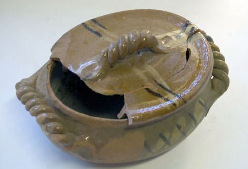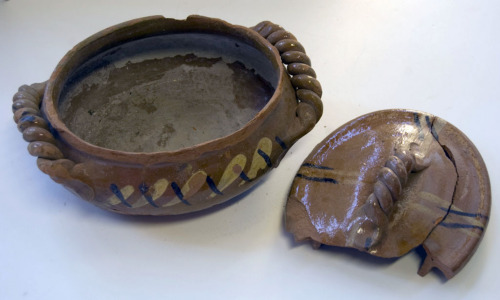 recipiente in terracotta smaltata, a sezione ovale con fondo piatto, pareti panciute, bordo arrotondato e sporgente. Dotato di due manici contrapposti e attorcigliati sotto il bordo superiore. Decorazione pittorica astratta in colore giallo e marrone scuro lungo le pareti e sui manici. Recipiente completo di coperchio a sezione ovale in terracotta smaltata e decorata a linee gialle e marroni; al centro, manico attorcigliato. Il coperchio è spezzato in due parti e mancante di una parte ulteriore.