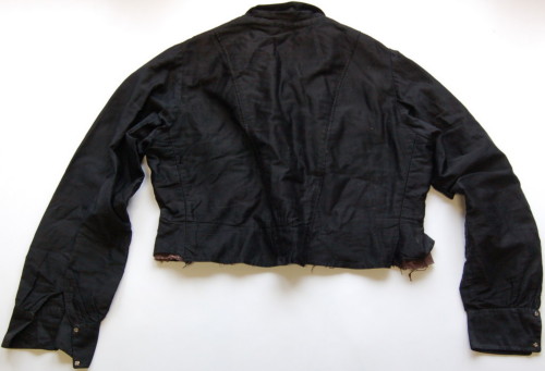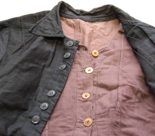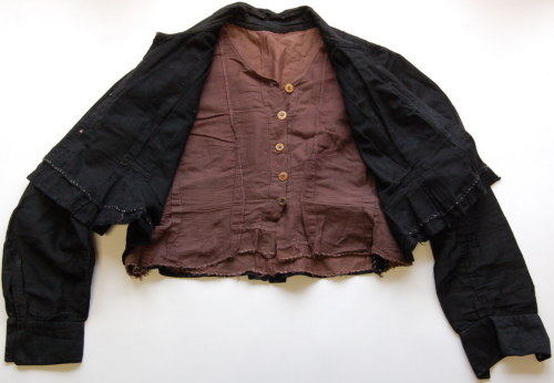 di colore nero; scollo tondo e abbottonatura semplice tramite 4 bottoncini #botòi# a pressione posti nella parte interna. Caratterizzato da alcune cuciture longitudinali decorative (4 lunghe sul davanti e 2 piccole sul retro) che vanno ad arricciare il bordo inferiore del corpetto. Fodera di colore marrone con riprese e chiusa sul davanti da 5 bottoni #botòi# uno diverso dall'altro. Maniche con polsini.