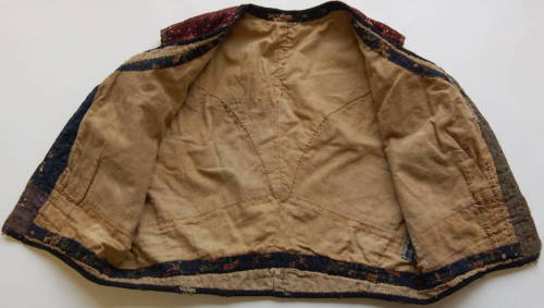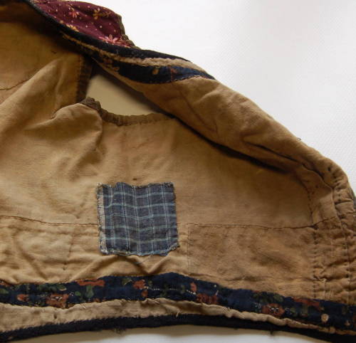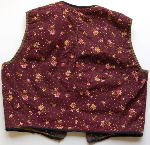 caratterizzato da una stoffa con motivi floreali gialli, rosa e verdi su sfondo violaceo. Scollo tondo e abbottonatura semplice tramite 9 bottoni #botòi#. Collo e bordo inferiore bordati con una fettuccia nera; maniche bordate con cotone marrone. Fodera beige e falde interne realizzate con ritagli di stoffe di diversa fantasia. Viste le numerose cuciture, si può dire che il panciotto sia stato realizzato attraverso il riutilizzo di alcuni scampoli scartati dalla produzione di altri vestiti.