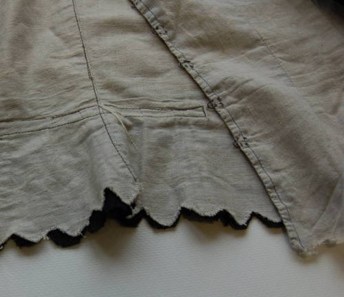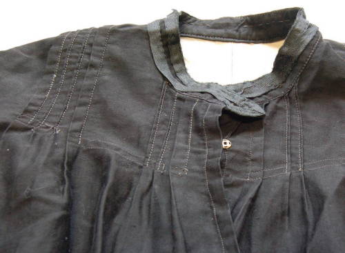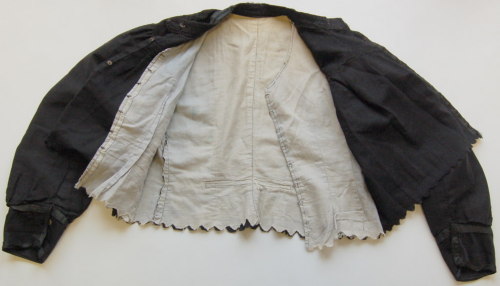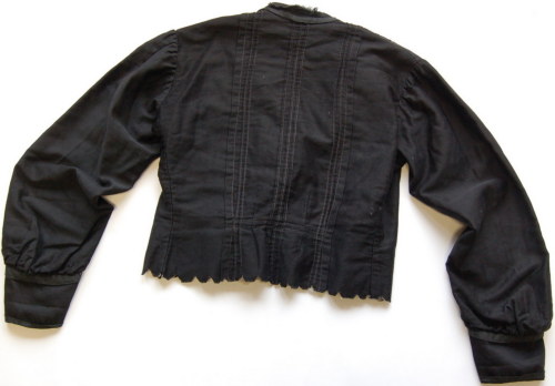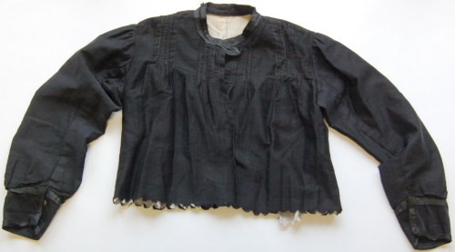 di colore nero, sfiancato, con scollo tondo e colletto a fascetta; abbottonatura semplice tramite due bottoni #botòi# a pressione. Presenta un carrè decorato da quindici riprese esterne sul davanti e nove più piccole sul retro. Le maniche sono leggermente arricciate e gli alti polsini sono chiusi con due bottoncini a pressione e decorati con una fettuccia in cotone rasato nero, che ricorre anche lungo il colletto. Il bordo inferiore è decorato da un taglio a cappette non rifinite. La fodera #fòdra# interna di colore grigio chiaro è chiusa da sette gancetti metallici.