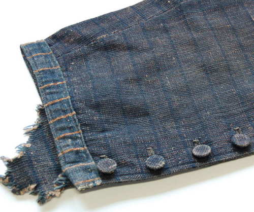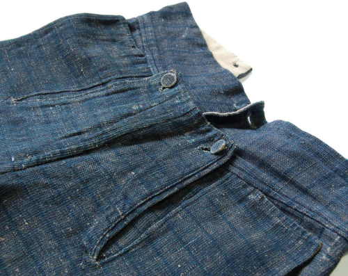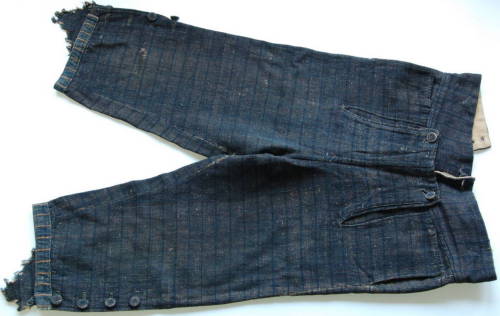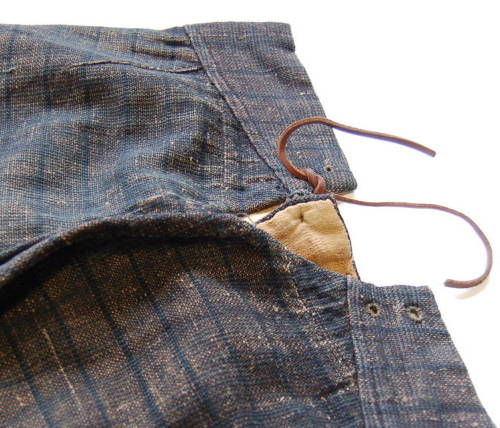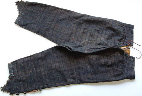 calzoni lunghi fino a metà polpaccio con cintura in vita larga sul davanti e sempre più stretta verso il dietro. Spacco posteriore con quattro fori per l'insermento del laccio in modo da stringerli alla vita. Chiusura sul davanti tramite tre bottoni #botòi# e ? chiuso da due bottoni. Tasche laterali realizzate senza tagliare la stoffa in abbondanza in questo modo da risultare un po' nascoste. Parti inferiori delle gambe caratterizzate da due spacchi laterali chiusi con quattro bottoni l'uno (bottoni rivestiti con la stessa stoffa). La tela interna fodera solo la parte superiore dei calzoni.