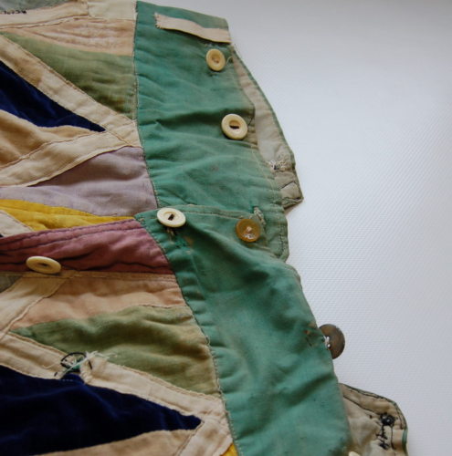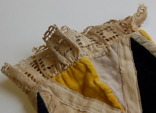 realizzati attraverso l'assemblaggio di rombi bicolori (nero, beije, bu scuro, violetto, verde, giallo, rosso) contornati da fettucce bianche. Il cinturino, di colore verde, è più largo sul davanti rispetto al dietro ed è caratterizzato dal alcuni bottoni #botòi# sui quali si appendevano le bretelle (quattro davanti e due dietro). Dietro, la centro, c'è un piccolo spacco a "V" sotto il quale si trova un cinturino con la fibbia per stringere i calzoni alla vita. Abbottonatura sul davanti tramite tre bottoni di cui due a vista e tre nascosti. La fodera è in cotone bianco con alcune righe blu e va a costituire anche una tasca interna sulla destra. Lungo il bordo inferiore delle gambe è applicato un merletto beije.