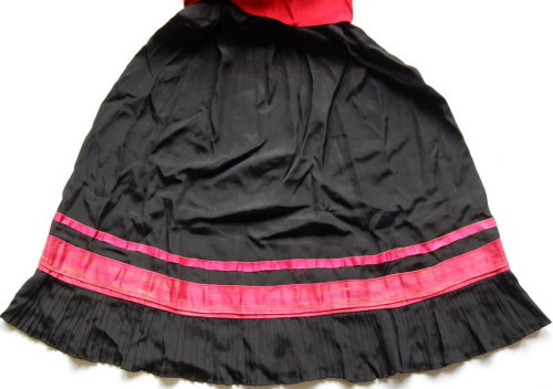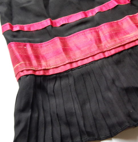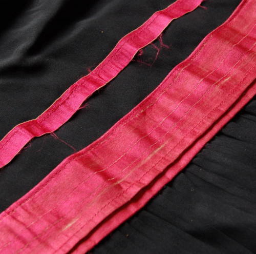 nera, conturino con elastico e due passanti ai lati. Chiusura sul retro tramite un gancetto metallico e quattro bottoni a pressione. Bordo inferiore decorato con due fasce parallele di colore rosso-fucsia (una stretta e l'altra più larga e con un piccolo risvolto) sotto le quali è cucita una fascia in cotone leggero plissettato.