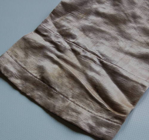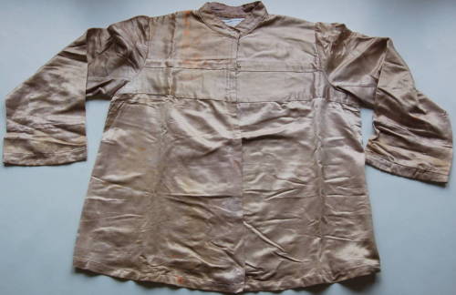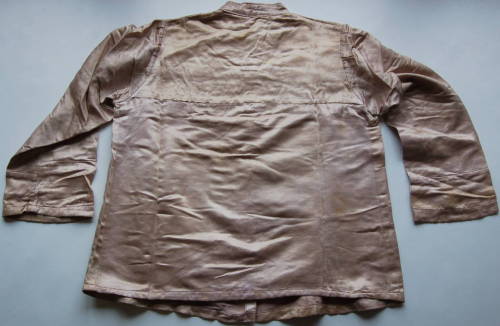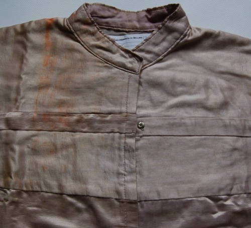scollo tondo, colletto a fascetta e carrè davanti e dietro realizzato con la steffa stoffa, ma posta orizzontalmente anzichè verticalmente. Abbottonatura sul davanti tramite quattro bottoni a pressione cuciti nella parte interna. Solamente dietro il carrè è stata cucita la fodera, in cotone azzurrino. I polsini presentano una doppia cucitura parallela.