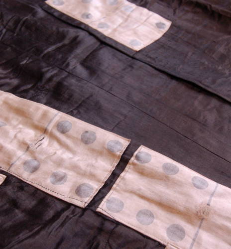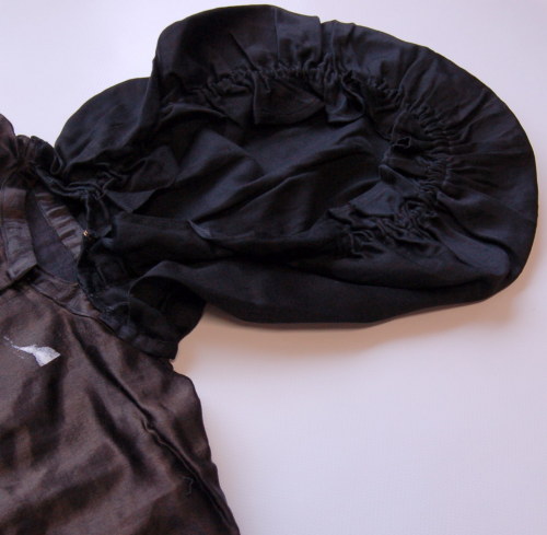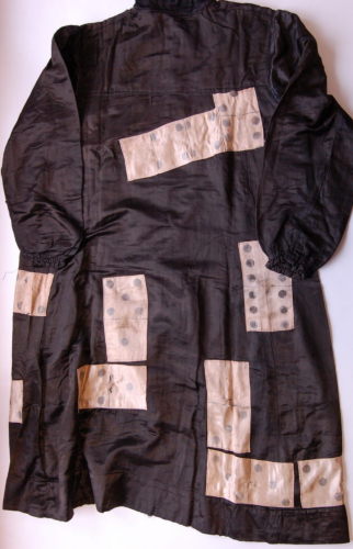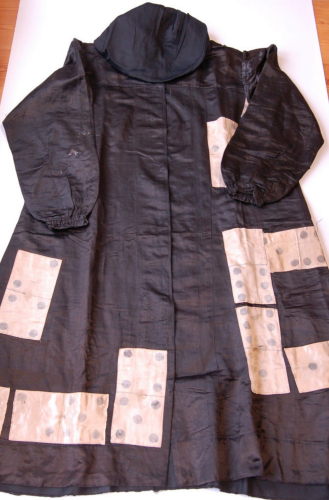 lunga tunica nera con scollo tondo bordato e carrè davanti e dietro. Abbottonatura sul davanti tramite otto bottoni a pressione cuciti internamente (alcuni, di fattura diversa, sono stati cuciti in un secondo momento). L'interno dell'abbottonatura e del bordo inferiore sono rinforzati da una lista interna. I polsini sono arricciati da un elastico, così come il cappuccio in cotone. La tunica è abbellita da alcuni tasselli in cotone rasato bianco che riproducono i pezzi del gioco del domino.