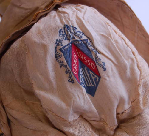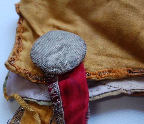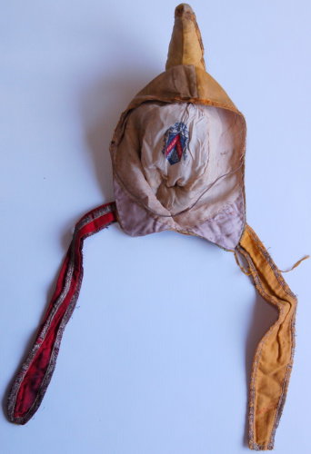 fasce di stoffa gialle e verdi (due per lato) decorate da una fettuccia con filamenti dorati sovrapposta alle cuciture laterali e la bordatura inferiore. Corno riempito di ovatta e piegato in avanti. Piccolo spacco sul retro. Ai lati ci sono due grandi bottoni #botòi# rivestiti in stoffa dai quali partono due fasce (a destra rossa e a sinistra gialla)decorate anch'esse con la stessa fettuccia. Fodera in cotone bianco tranne dietro i bottoni dove è in cotone rasato lilla. Al centro della fodera è stata cucita una stoffa con disegnato il marchio del cappello dal quale è stata riciclata. Il berretto viene fissato alla testa grazie ad un elastico.