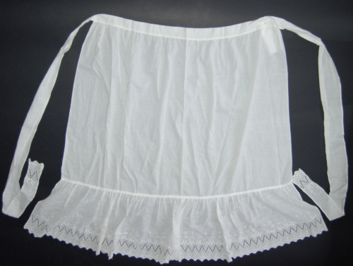 Formato da sette pezzi di cotone bianco assemblati a mano. La cintura è composta da una fascia centrale e due fasce laterali a destra e due a sinistra, alle cui estremità è presente un ricamo floreale a punto pieno e geometrico traforato. Entrambi terminano a punto festone così come il bordo inferiore del grembiule nel quale si ripete lo stesso ricamo. Questo è unito al grembiule tramite una cucitura ricoperta posteriormente da una fettuccia di cotone bianco. In questa zona sono presenti numerose arricciature.