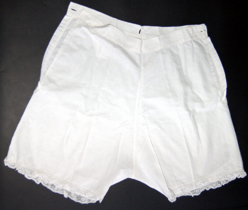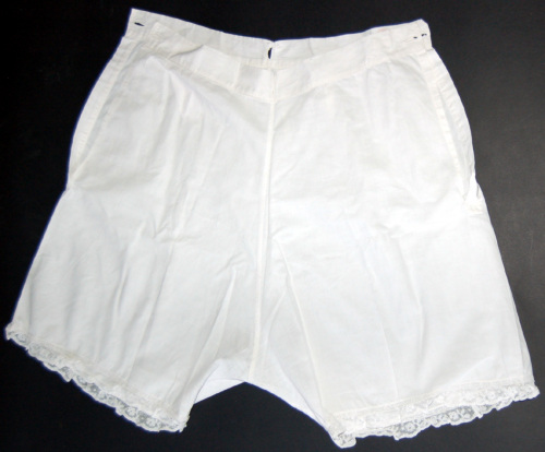 Corte e sgambate di colore bianco in tessuto di cotone. In vita c'è un cinturone con tre asole sia sul davanti sia sul dietro. Sul dietro ci sono quattro riprese. Davanti è presente una cucitura centrale. Al termine dei due gambali è applicato un merletto fatto a macchina che termina con motivo a festone.