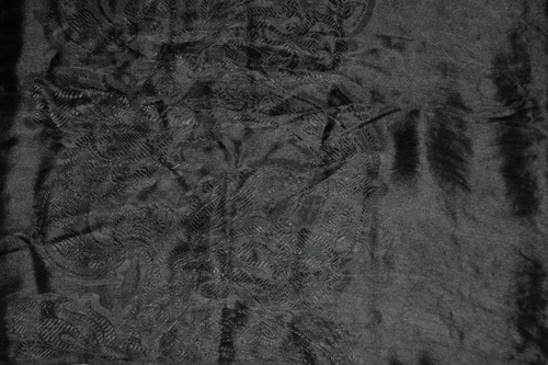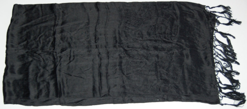 In cotone rasato nero tipo damascato. Sui due lati più corti annodate ci sono delle frange. Produzione industriale.