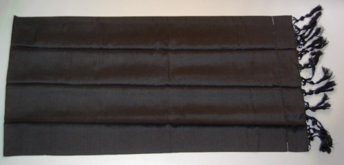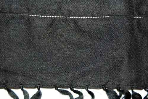In seta nera. Di forma rettangolare. Sui due lati più corti a circa 8 cm. dalle frange c'e un decoro a punto quadro. Le frange annodate sono undici per parte.