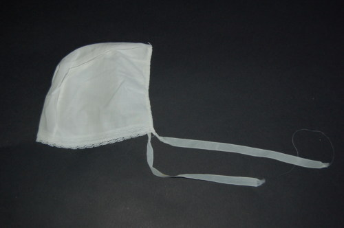 Composta da tre pezzi di cotone cuciti a macchina. La parte che incornicia il volto è arricchita con due merletti fatti a macchina, terminanti a punto festone. La chiusura sul davanti è composta da due nastrini in pelle d'uovo. Ai due lati ci sono due riprese.