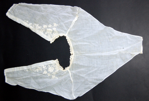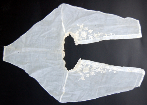 Formata da tre pezzi di stoffa di cotone bianco assemblati con cucitura a mano. Nella parte inferiore è applicato un merletto con motivo floreale che termina a punto festone. La chiusura è formata da un bottoncino di madreperla e da un'asola sporgente in cotone. Il motivo floreale presente sulla pettorina è a punto pieno e traforato.