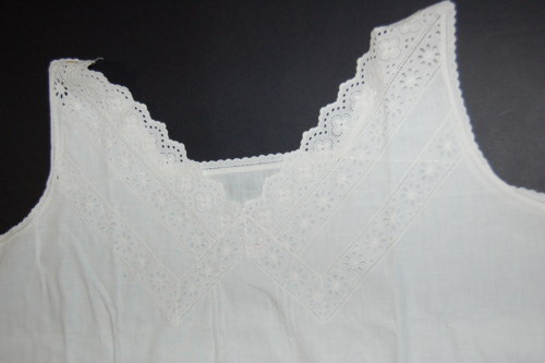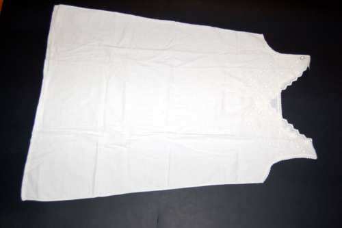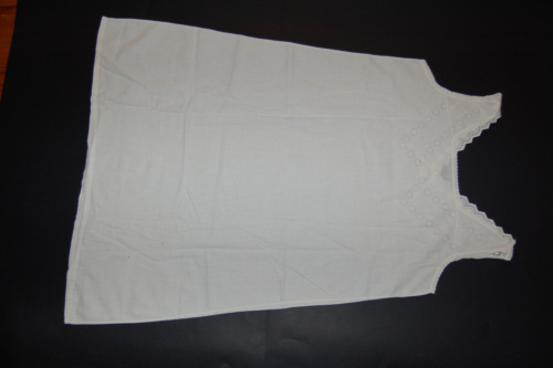 Lunga camicia in cotone bianco senza maniche, con due spalline che si chiudono sull'estremità tramite un bottone ed un'asola. Sullo scollo è presente un merletto con motivi floreali terminante a punto festone. Merletto che si trova anche sulle spalline dove è presente anche un motivo a punto quadro (?). Nella parte centrale sono presenti tre piccole pieghe a destra e a sinistra. Termina svasata.