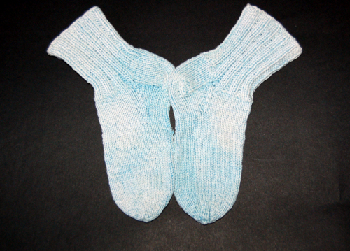 In cotone azzurro realizzati a ferri. Il gambale e stato lavorato a costine;il piede a maglia rasata.