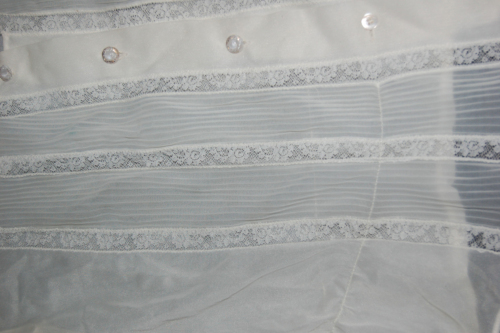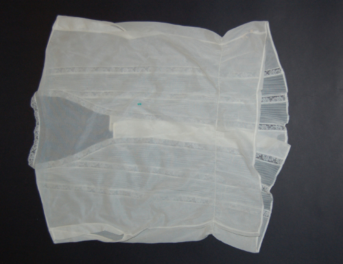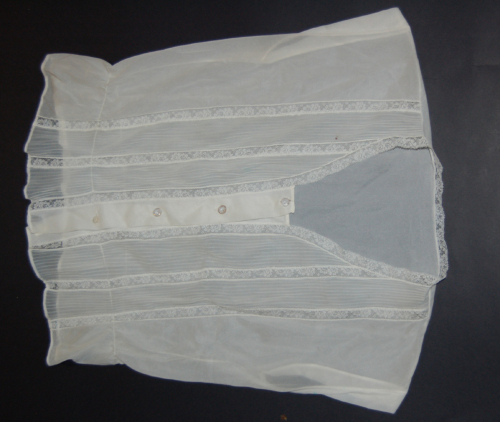 Camicia in seta(?) bianca senza maniche. Davanti è presente l'abbottonatura femminile a vista. I bottoni sono quattro di plastica bianca con dei piccoli decori dorati. Presenta uno scollo a v dove è stato applicato un pizzo, pizzo che si trova anche nella parte davanti della camicetta intervallato a strisce orizzontali con la seta lavorata a piegoline.