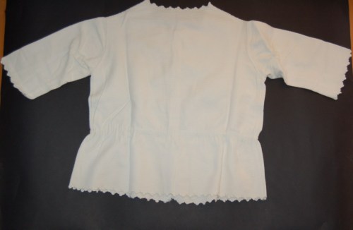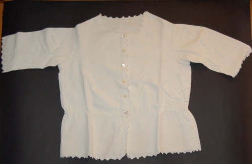 In cotone operato, felpato bianco, è assemblato a macchina. La chiusura, sul davanti, è composta da un'abbottonatura, femminile a vista,( formata da cinque bottoni in plastica bianca) e da un cordone di cotone che se tirato stringe il corpetto in vita. Lo scollo è a girocollo smerlato a punto festone. Il punto festone è presente anche sull'orlo delle maniche a trequarti e sulla zona dell'abbottonatura.
