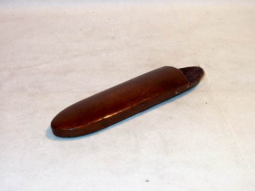 Astuccio in legno di forma ogivale con terminale basculante; pezzo di fattura molto semplice.