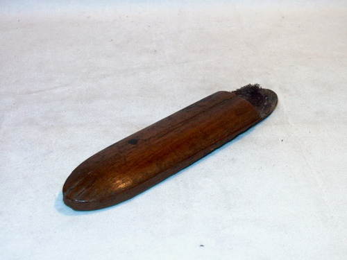 Astuccio in legno di forma ogivale con terminale basculante; pezzo di fattura molto semplice.