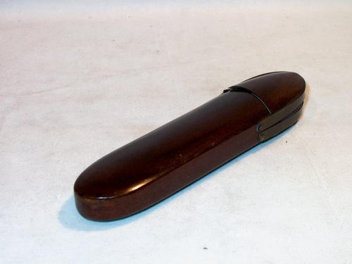 Astuccio in legno di forma ogivale con terminale basculante; pezzo di fattura molto semplice.