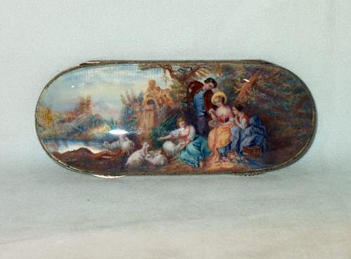 Astuccio ovoidale in argento inciso. Sulla parte superiore è laccata una scena campestre settecentesca.