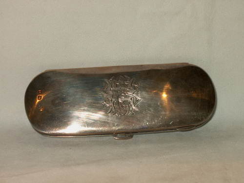 L'astuccio di forma ovale è in argento. Punzoni dell'argento: Birmingham, 1903 e le iniziali "SHE" sul dorso.