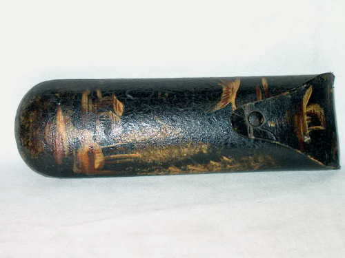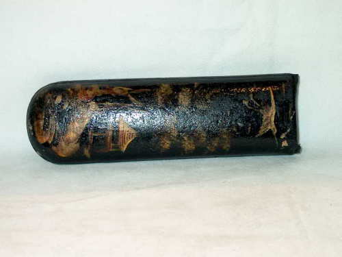 Astuccio in cartapesta di forma ogivale con terminale basculante. Sul dorso sono dipinte, su fondo nero, delle cineserie.