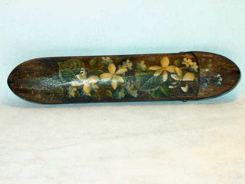 Astuccio in legno dipinto di forma ogivale con terminale basculante. Su una faccia: dipinte viole e myosotis, laccatura. Sull'altra:dipinti garofani e "SPA", laccatura.