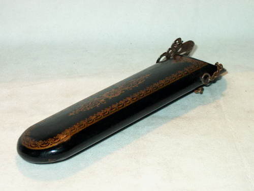Astuccio a chàtelaine in legno con intarsi sul dorso color oro; finiture e gancio sono in ferro.