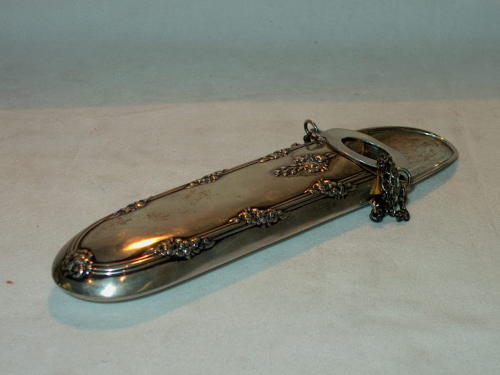 Astuccio a chàtelaine in argento con gancio del medesimo materiale. Sul dorso sono incisi dei motivi floreali semplici. Puzoni dell'argento: Chester, 1911.