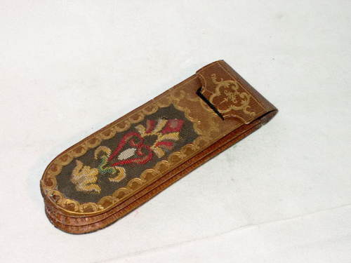 Astuccio in pelle marrone con chiusura a busta. L'esterno è lavorato con motivi color oro e ricami floreali nella parte centrale.