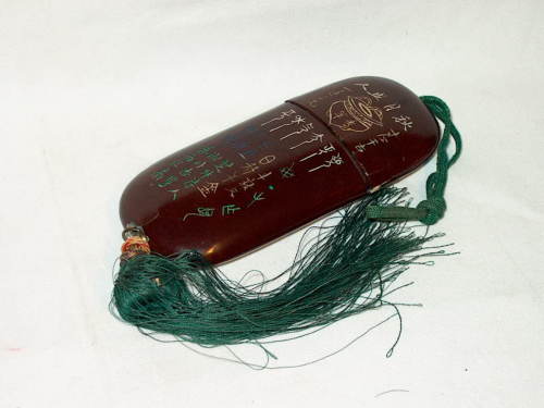 L'astuccio è in legno laccato bordeaux, con ideogrammi sul dorso.