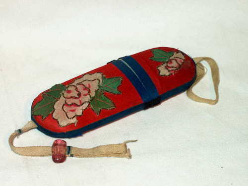 L'astuccio è in cartapesta, di forma ovale e ricoperto di carta rossa con alcune dalie incollate sull'esterno.