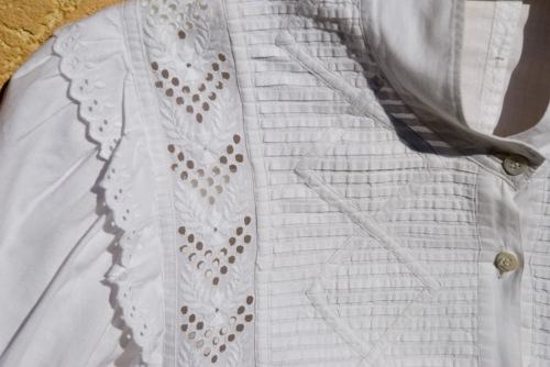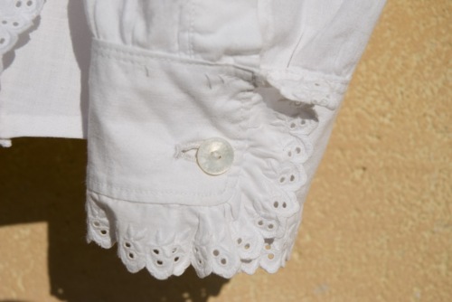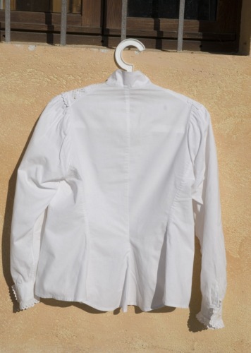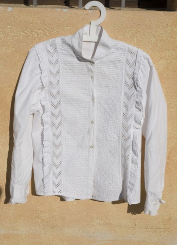 camicia in lino bianco. L'abbottonatura femminile a vista è davanti. I bottoni sono cinque di madreperla. Presenta colletto alla coreana chiuso da un bottone in madreperla uguale agli altri. Sul davanti della camicia il tessuto è lavorato a strisce orizzontali e rombi e sui bordi è applicato un pizzo di sangallo in cotone, il medesimo pizzo si trova sui polsini, che sono chiusi ciascuno da un bottone.