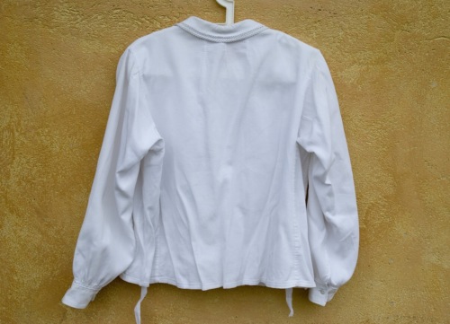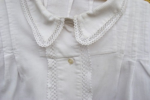 camicia in cotone piquet rigato bianco con piccolo colletto a punta bordato da un basso (1.5 cm) pizzo all'uncinetto. L'abbottonatura femminile a vista è davanti. I quattro piccoli bottoni sono di madreperla. Sul davanti dalle spalle scendono per 13 cm tre pieghette con conseguenti pinces. Sul dietro ci sono tre pinces all'altezza del collo. I polsini sono foderati con lino bianco e sono chiusi da un bottoncino. All'interno all'altezza della vita sono cucite due fettucce, che, una volta allacciate, fanno aderire la camicia al corpo.