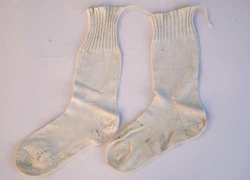 realizzati ai ferri con cotone di colore bianco: la parte superiore del gambale è lavorata a costine, il resto e il piede a maglia rasata. Il bordo superiore è stretto da una piccola treccina in cotone che continua libera per 6 cm. Sul gamabale, appena al di sotto delle costine, sono ricamate con filo bianco le iniziali OV.