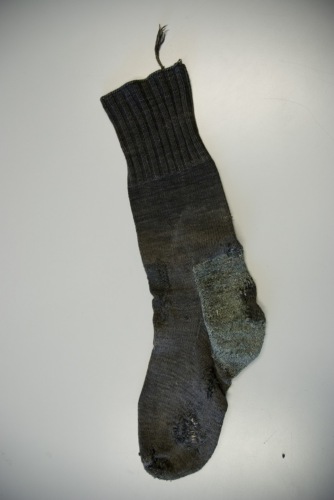 realizzati ai ferri con cotone di colore grigio e verde chiaro: la parte superiore del gambale è lavorata a costine, il resto e il piede a maglia rasata.